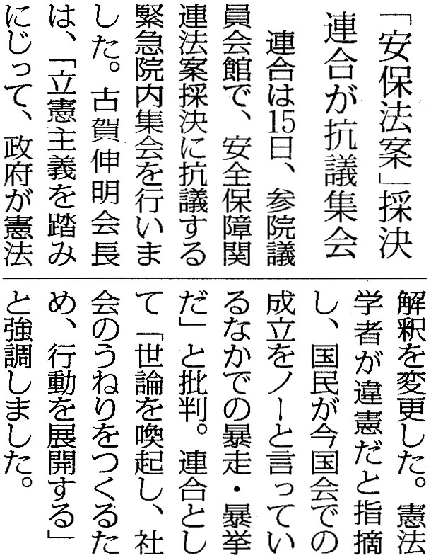 2015年7月16日 「安保法案」採決 連合が抗議集会 Tweet 「しんぶん赤旗」日刊紙2015/07/16付(クリックで拡大できます)。 関連する記事 戦争法案採決に連合が抗議集会 しんぶん赤旗 見本紙または購読の申込み